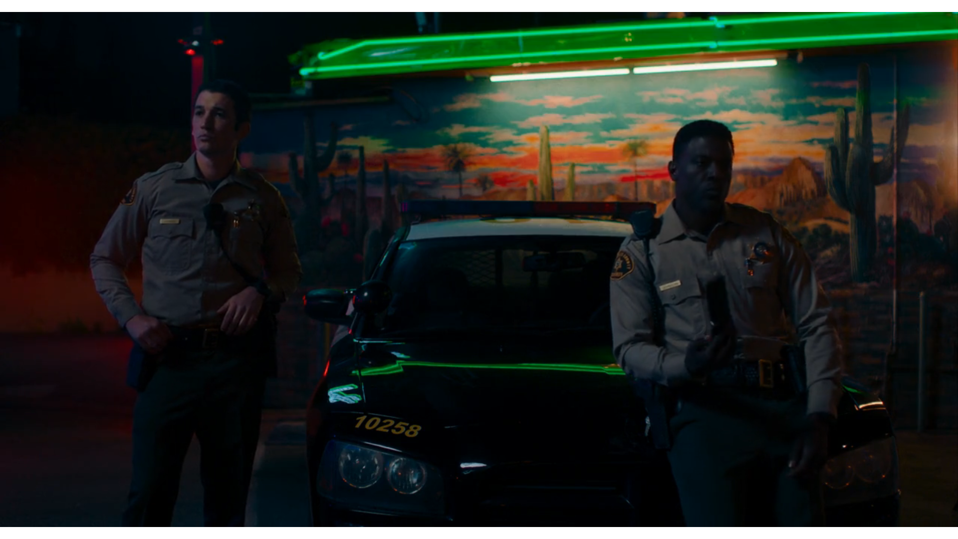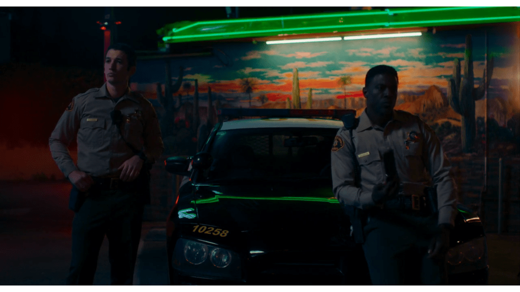 Notte a Los Angeles. Un murales del Messico dipinto a colori vivaci, lenta carrellata, due ufficiali di polizia, in piedi, appoggiati alla volante. Riflessi dei neon sulla scocca lucida dell’autovettura. Uno dei due dice, “It’s like we’re not even in control of our lives”, e infatti un killer irrompe dall’oscurità e fa fuoco. Comincia così Too Old To Die Young, ambientato in un’esoterica striscia di confine tra USA e Messico.