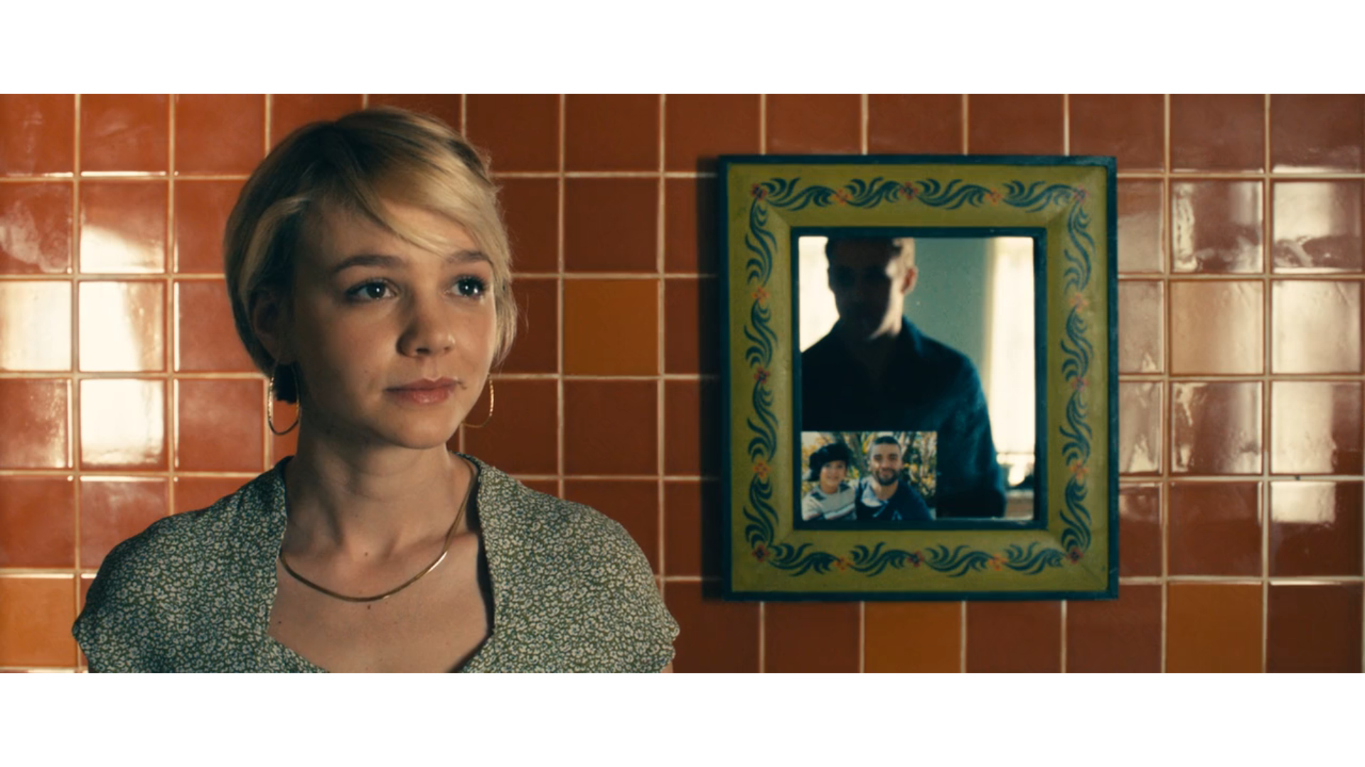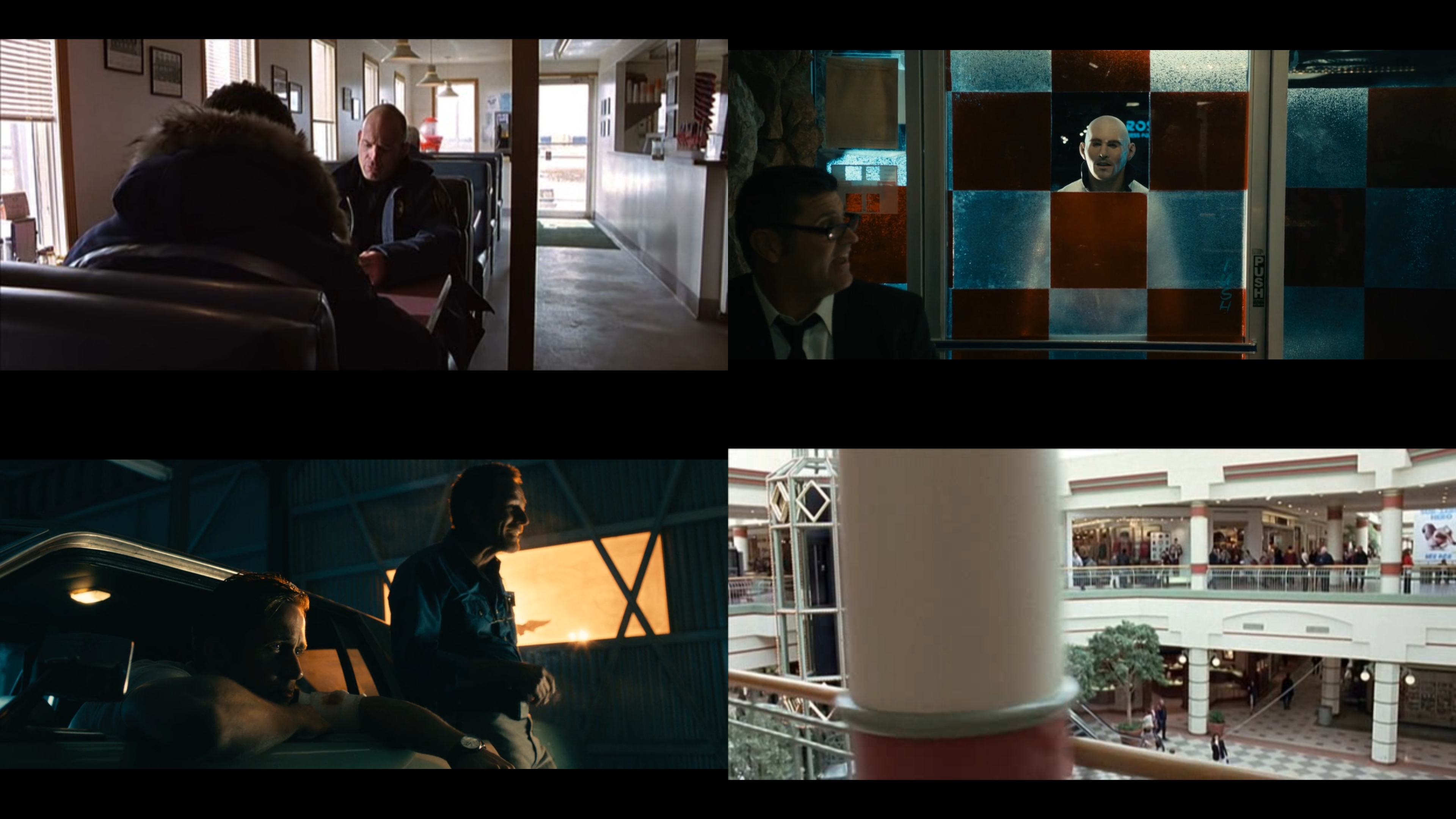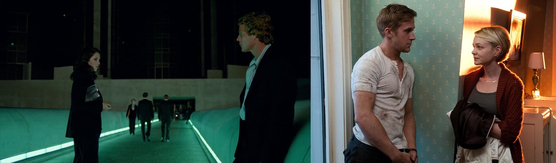Sopra, Drive. Inquadratura emblematica. Irene fissa Driver, incastonato nello specchio dove figura la foto della sua famiglia. Come se Driver fosse vicino ma al tempo stesso distante, con il marito Standard che si frappone tra loro, e contemporaneamente il viso di Driver sottoesposto, avvolto in un alone tetro, indistinto, che ne occulta la natura violenta e insondabile.
