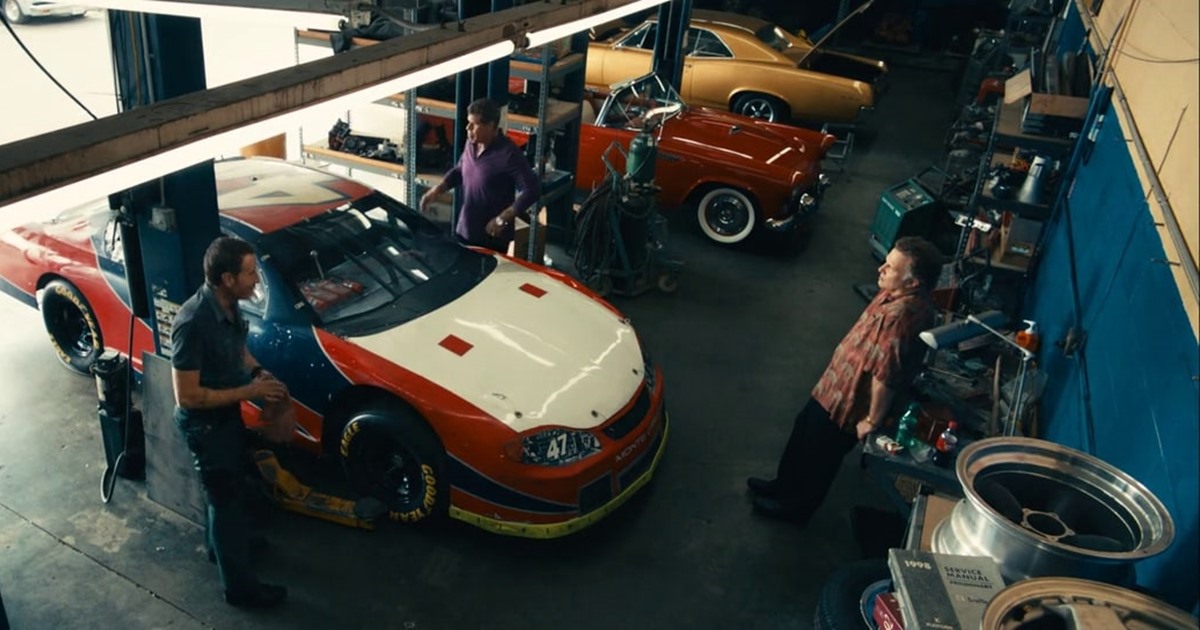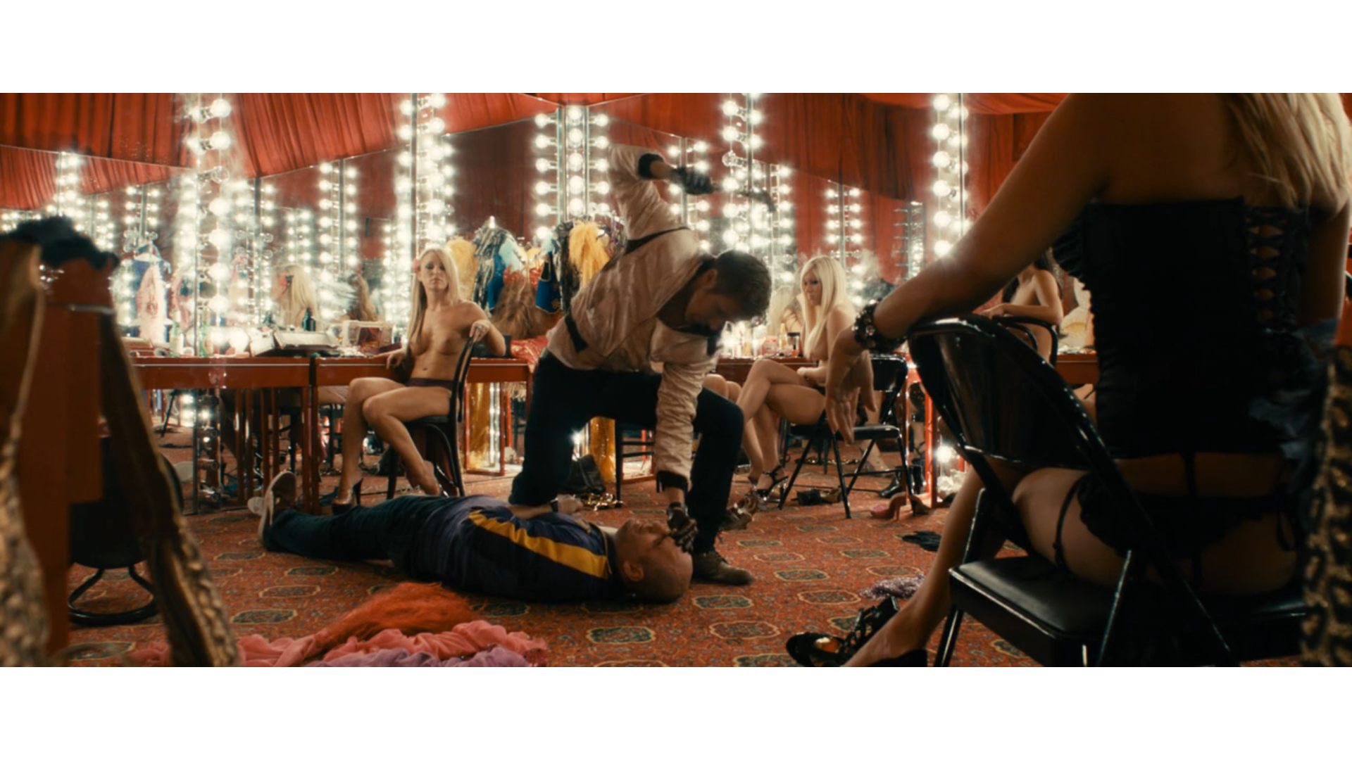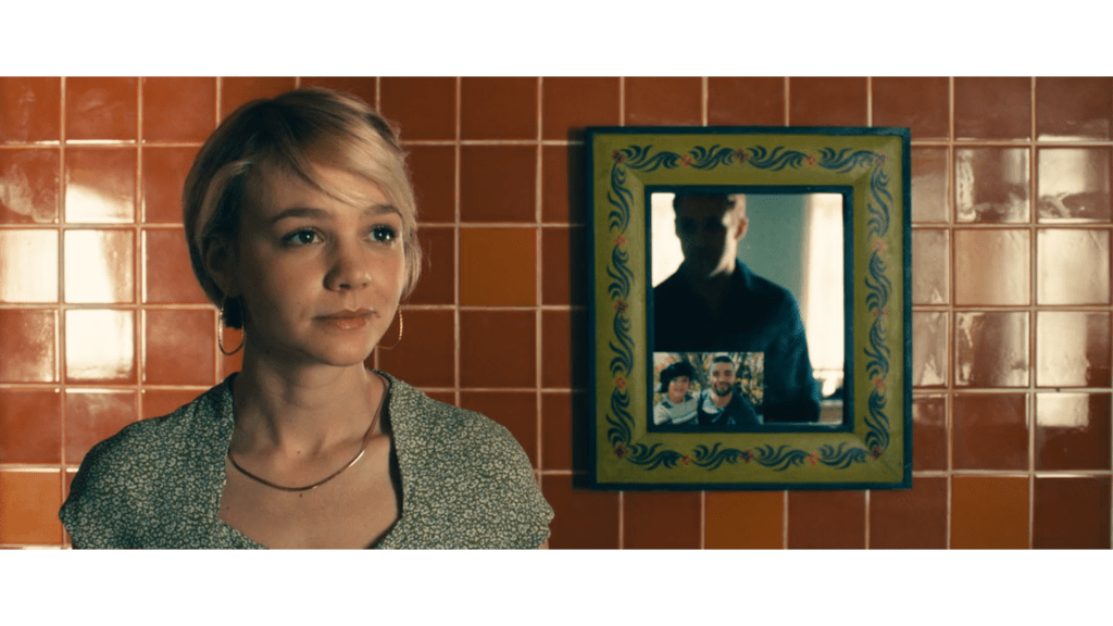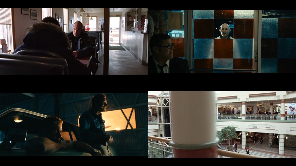 Sopra, Drive. Inquadratura emblematica. Irene fissa Driver, incastonato nello specchio dove figura la foto della sua famiglia. Come se Driver fosse vicino ma al tempo stesso distante, con il marito Standard che si frappone tra loro, e contemporaneamente il viso di Driver sottoesposto, avvolto in un alone tetro, indistinto, che ne occulta la natura violenta e insondabile.