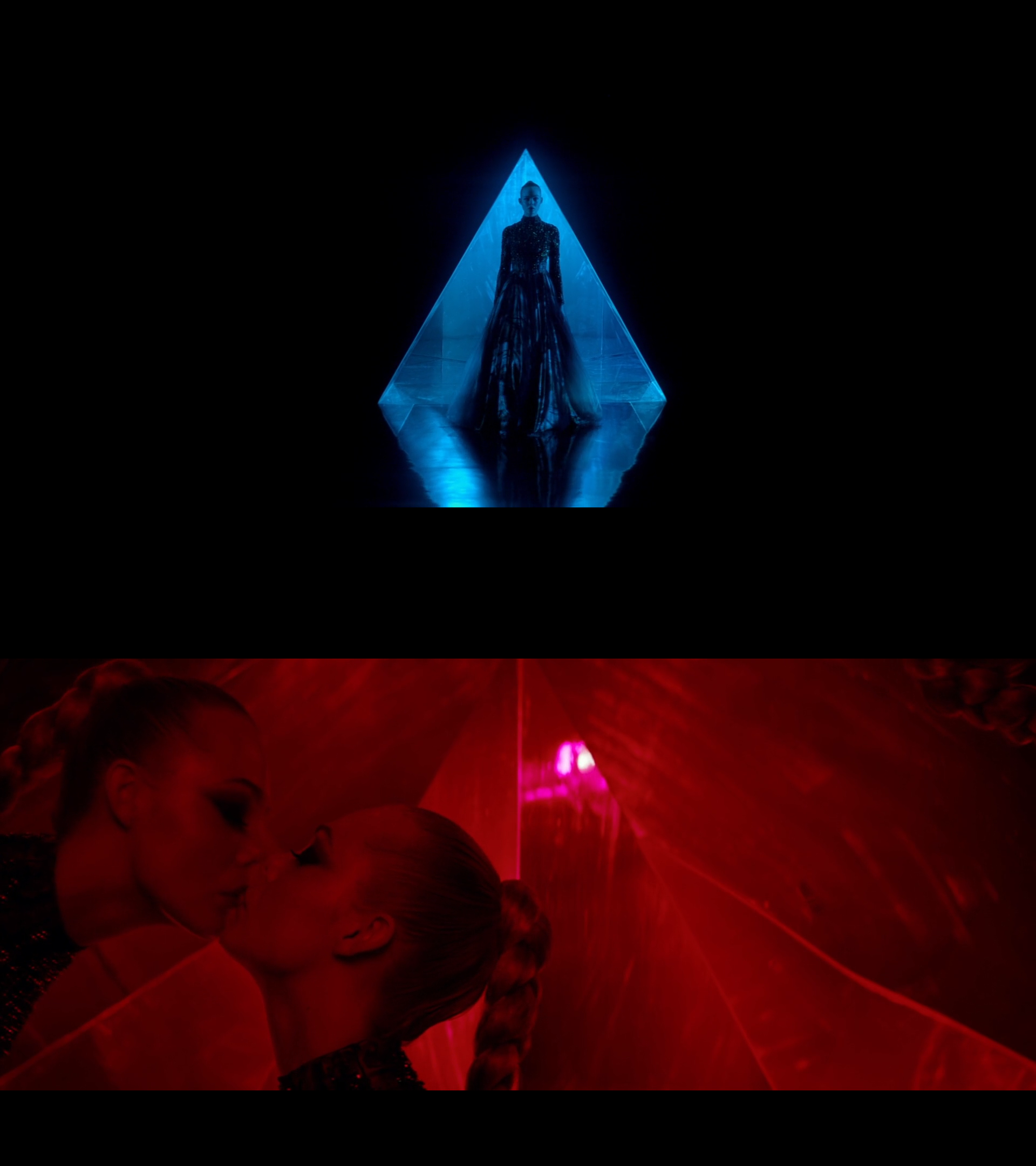 Nel momento in cui bacia il proprio riflesso uno e trino, Jesse si aliena da sé (dalla precedente versione di sé) e si consegna al feticcio del proprio riflesso, trasformandosi nella divinità algida e disincarnata che abita lo specchio.